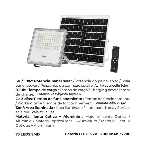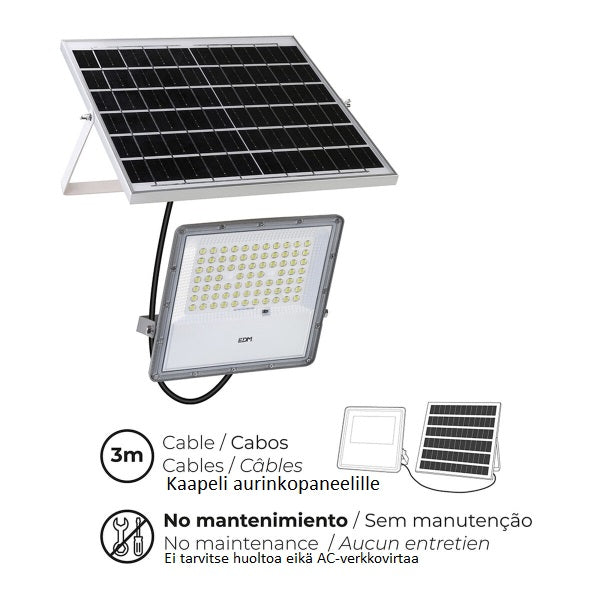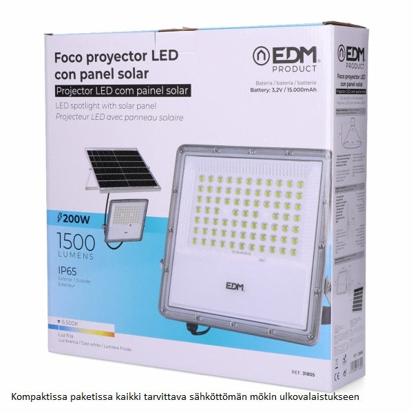 Aurinkoenergialla toimiva LED-ulkovalopaneeli EDM 31855 200 W 1500 lm 6.500 K, litium-akku, kaukosäädin, aurinkopaneeli + kiinnitystelineet