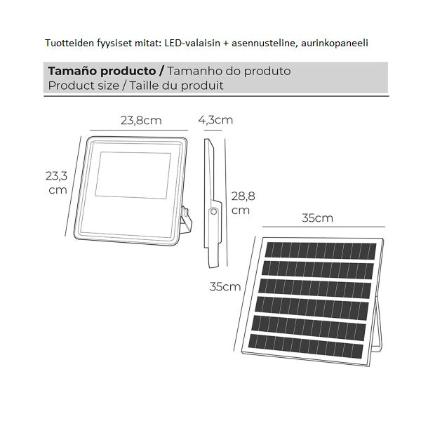 - Aurinkopaneeli: 35 x 35 cm