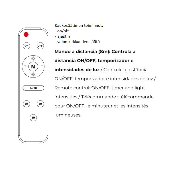 Kaukosäädin: noin 8 metrin kantamalta valon on/off, ajastuksen ja kirkkauden säätö.